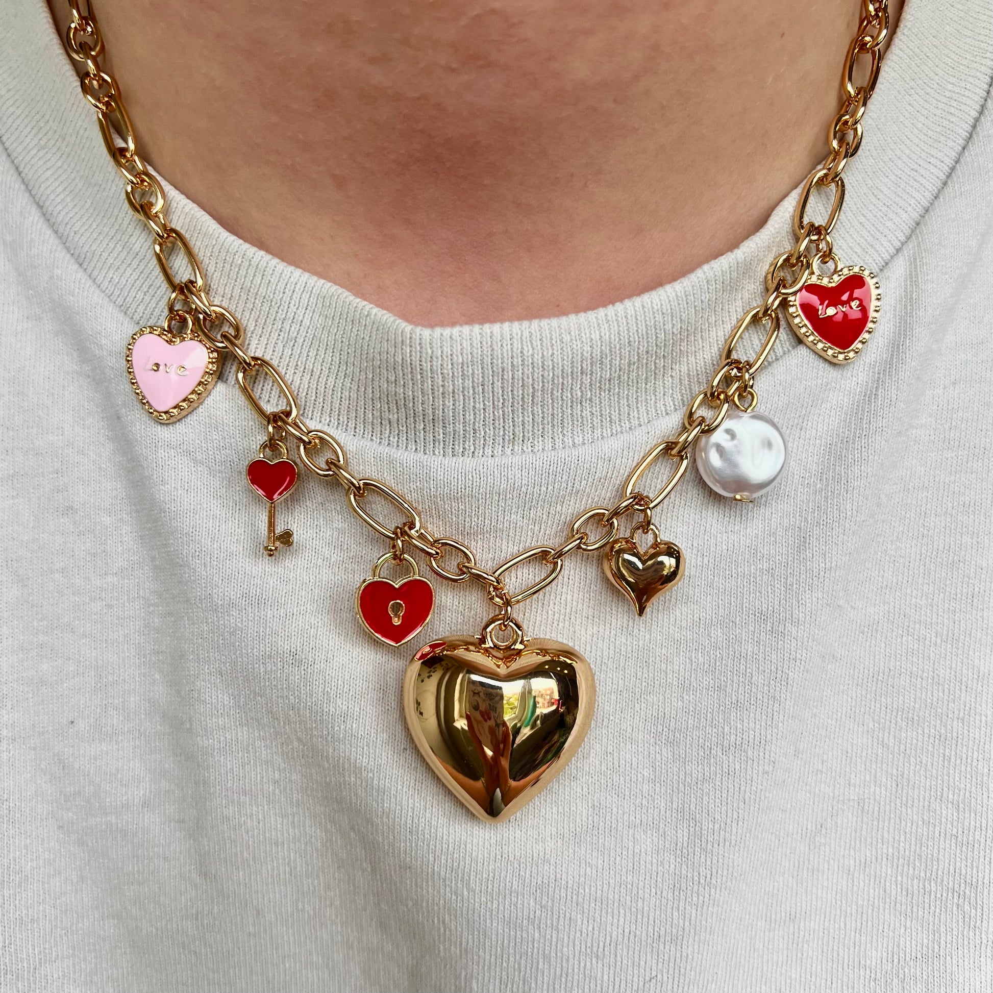 Het is een roestvrijstalen ketting met een groot hard en nog andere leuke bedeltjes in het love thema. De ketting is verstelbaar!