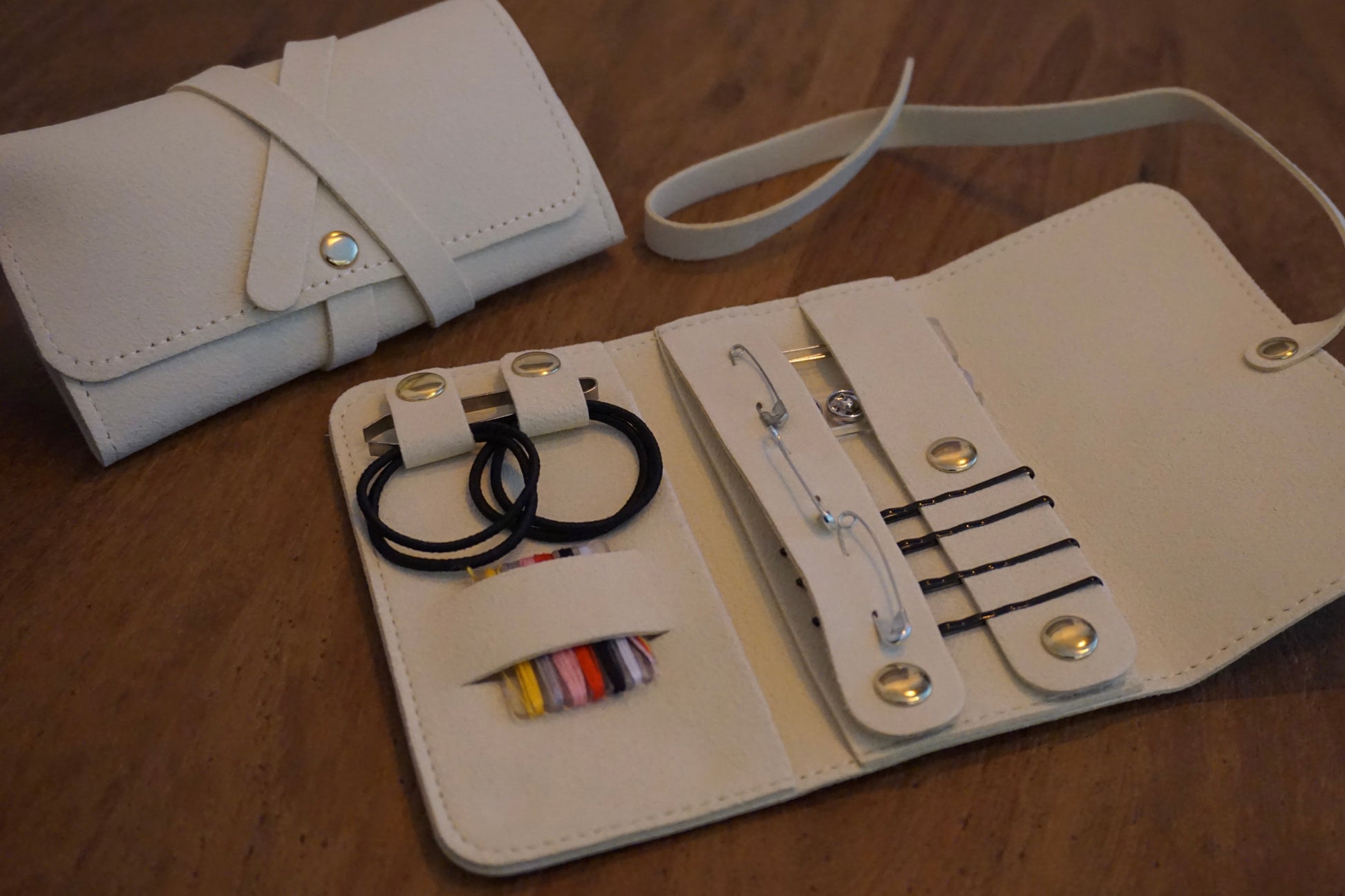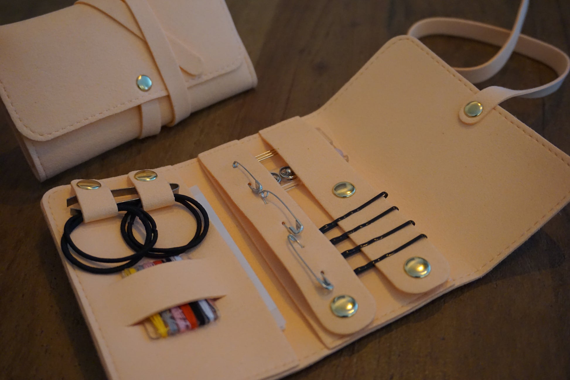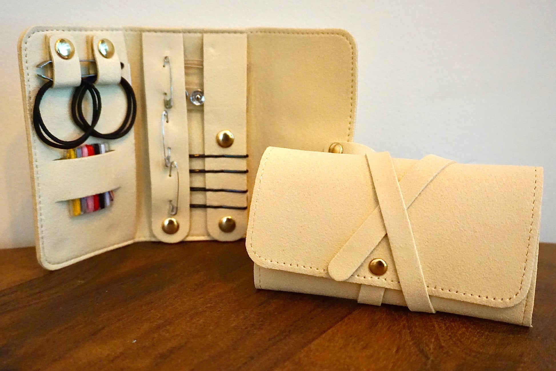 - 4 schuifspeldjes (Handig om stof, bandjes of accessoires tijdelijk op hun plek te houden. Ook praktisch bij haar, sjaals of lichte stoffen)