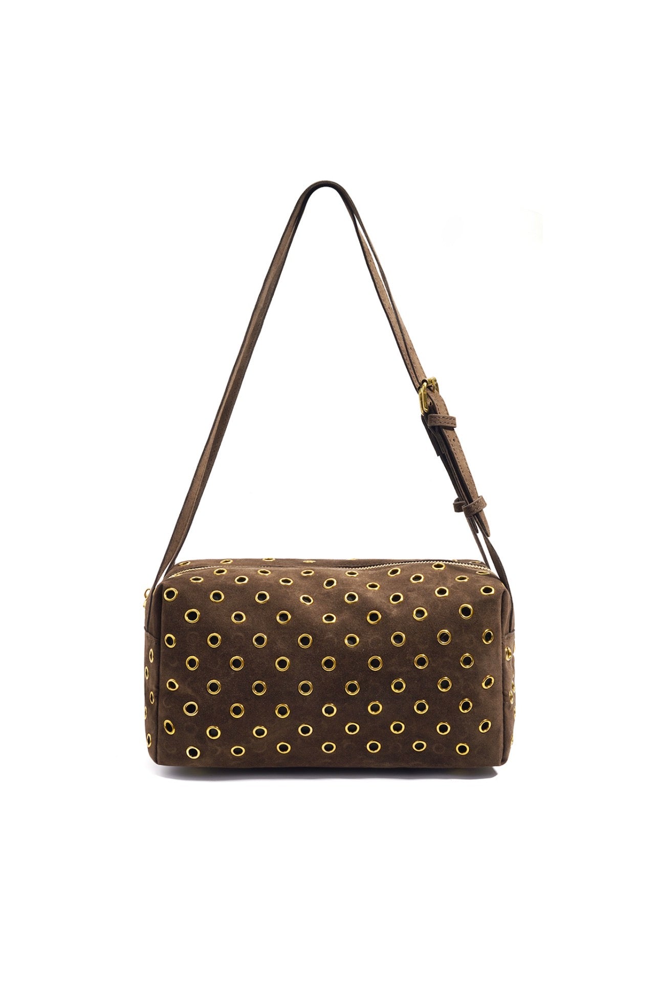 compacte schoudertas van bruin polyester, afgewerkt met goudkleurige oogjes voor een stijlvolle look. Voorzien van een verstelbare schouderband en een tijdloos ontwerp dat elke outfit compleet maakt.